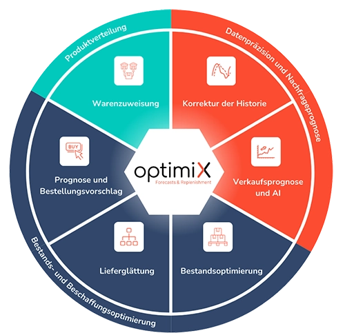 Die SaaS-Software OptimiX XFR unterstützt Einzelhändler bei der Optimierung ihrer Supply Chain. Supply Chain-Lösung durch immer genauere Prognosen und ein hochleistungsfähiges Bestandsmanagement. Durch die Kombination von künstlicher Intelligenz, fortschrittlicher Datenanalyse und Branchenexpertise ermöglichen wir es unseren Kunden, die Nachfrage präzise zu antizipieren und ihre Lieferungen entsprechend anzupassen.
